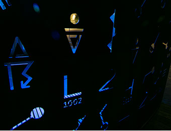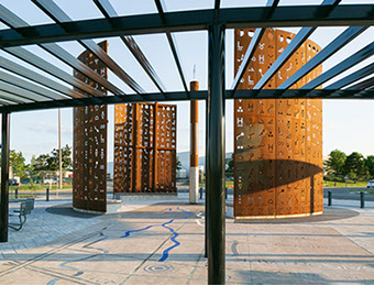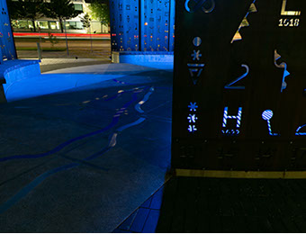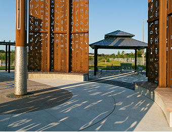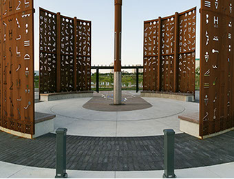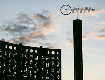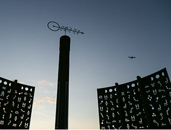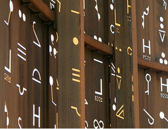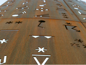 The artwork comprises four large steel panels that reflect the four seasons. Within each of these panels, there are four vertical columns of hieroglyphs, each of which depicts the weather conditions that occurred during that month. Along