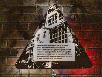 To develop the content for this installation, we interviewed 18 leading city builders in the Toronto region. Through a variety of artistic vehicles that afford special attention to human scale and multi sensory experience, Shifting Boundaries explores the critical challenges to advancing sustainable and liveable urban environments.